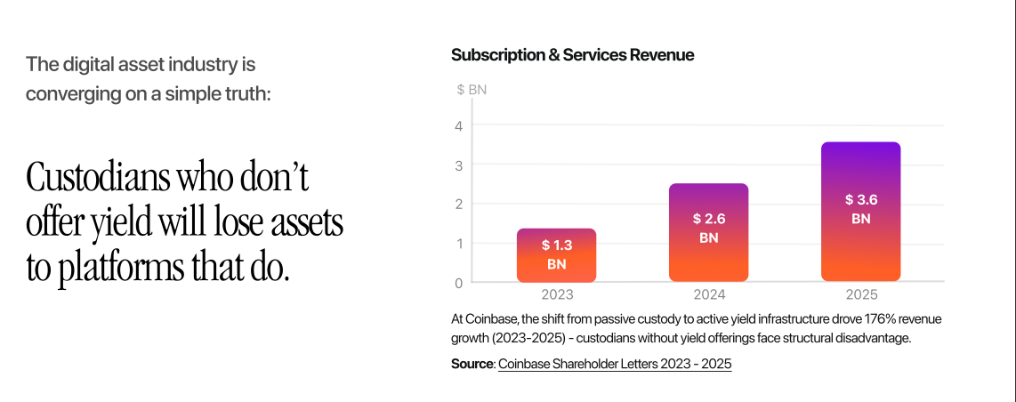 At Coinbase, the shift from passive custody to active yield infrastructure drove 176% revenue growth (2023–2025)—and custodians without yield offerings face a structural disadvantage. (Source: Coinbase Shareholder Letters 2023–2025)