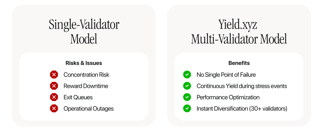 Under a single-validator model, the risks and issues cluster around concentration risk, reward downtime, exit queues, and operational outages. Under the Yield.xyz multi-validator model, the intended benefits are no single point of failure, continuous yield during stress events, performance optimization, and instant diversification across 30+ supported validators.