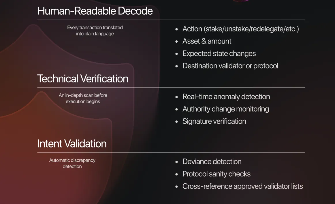 First is Human-Readable Decode, where every transaction is translated into plain language, including the action (stake/unstake/redelegate/etc.), the asset and amount, the expected state changes, and the destination validator or protocol.