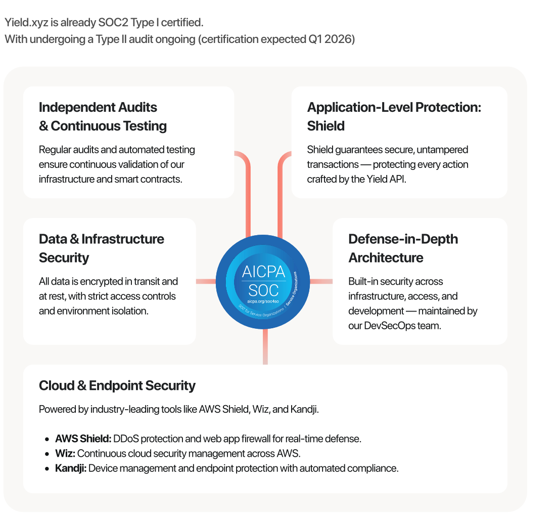 Yield.xyz is SOC2 Type I certified, with a Type II audit ongoing (certification expected Q1 2026).