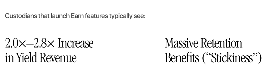Custodians that launch Earn features typically see a 2.0×–2.8× increase in yield revenue. The note argues that every validator and protocol integration typically requires heavy engineering lift and maintenance, while Yield.xyz consolidates all of this into a single integration that keeps infrastructure costs fixed, allows yield revenue to scale with AUC, and enables a path to profitability on assets that previously generated zero revenue.